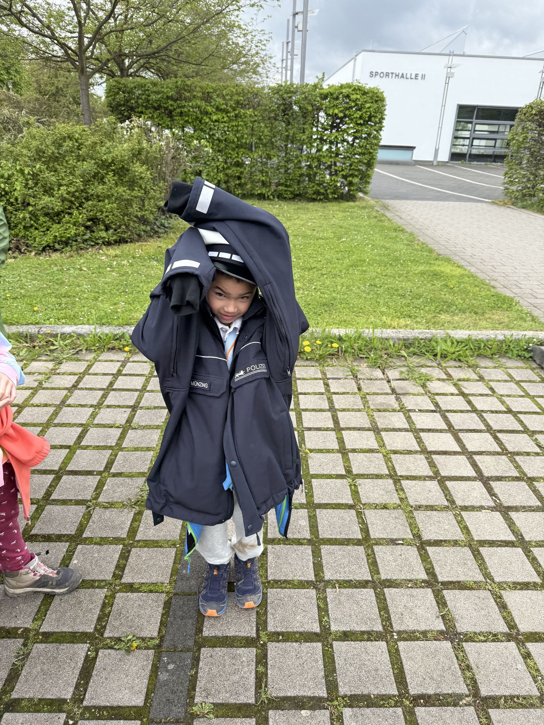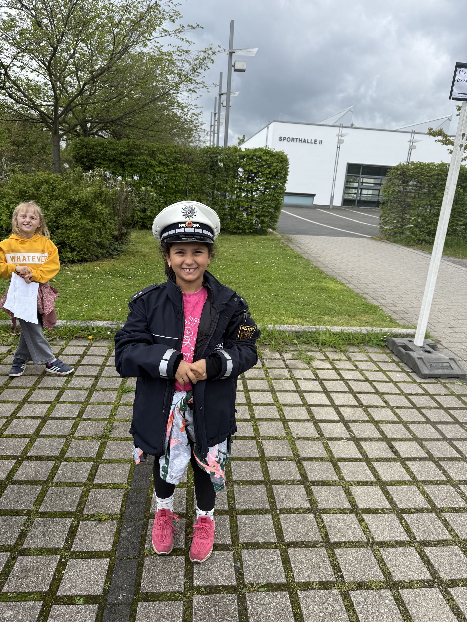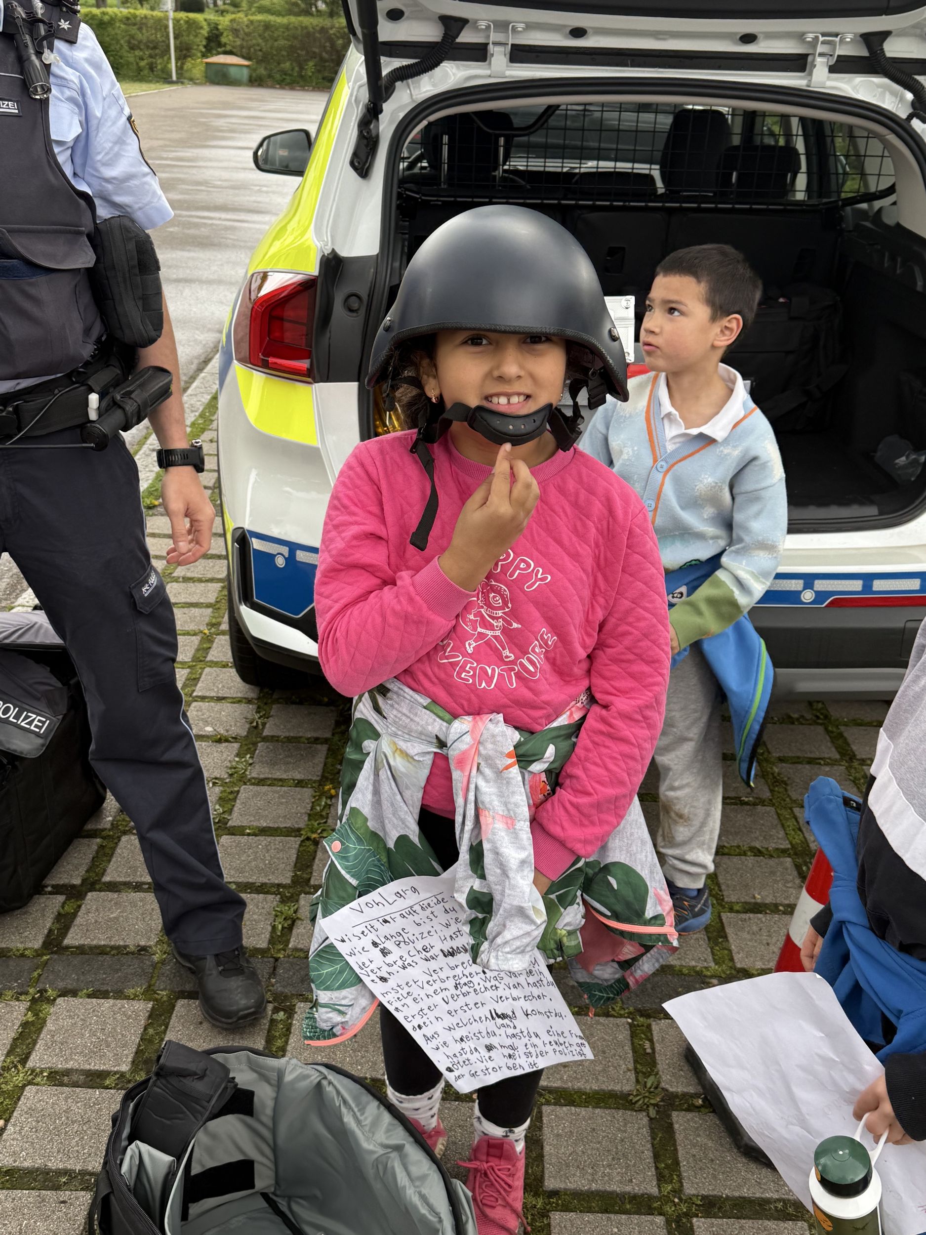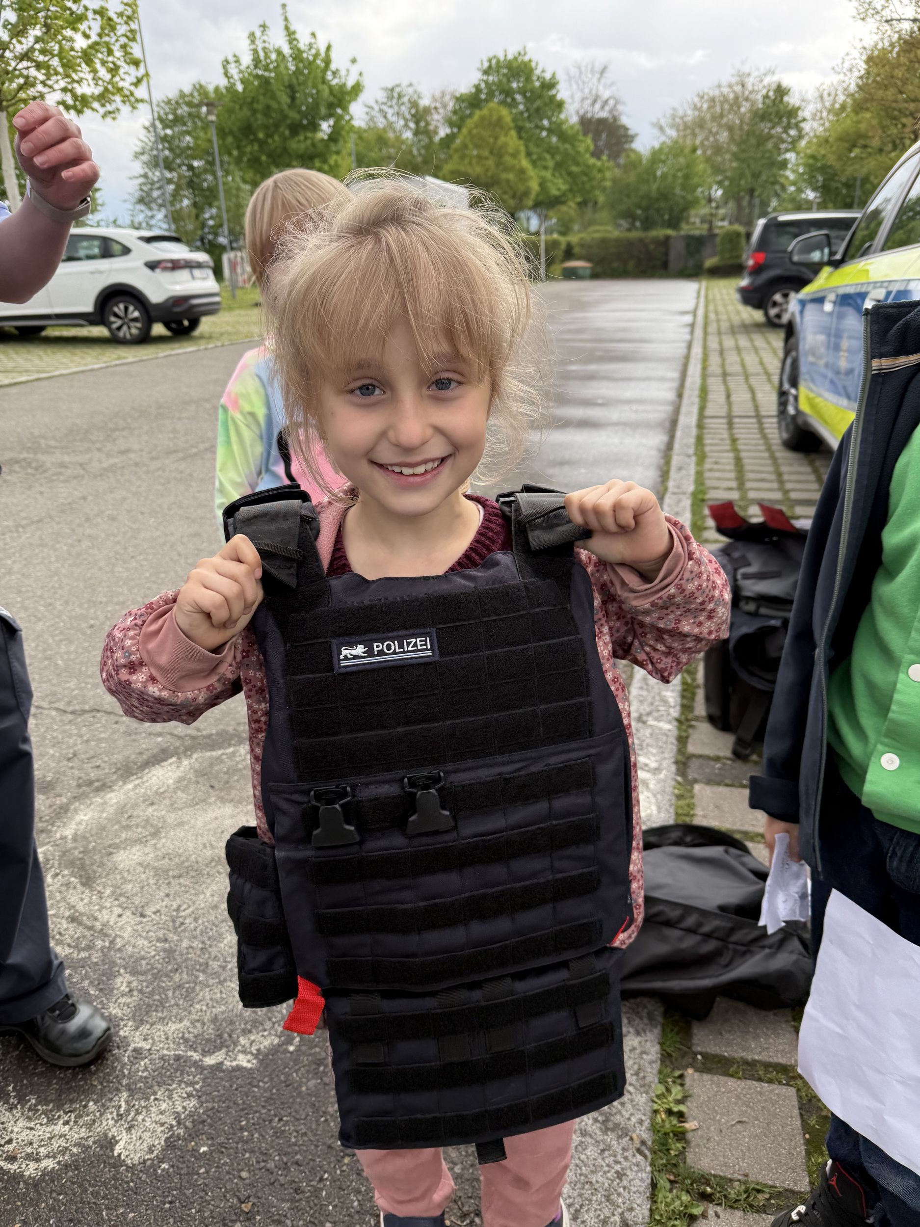 Nach der intensiven Fragerunde hatten die Kinder die Möglichkeit sich die Polizeiausrüstung im Auto aber auch am Körper der Polizisten genauer anzuschauen. Die Kinder durften viele Sachen der Ausrüstung ausprobieren oder auch anziehen, wobei sie am meisten Spaß dran hatten. Sie waren so stolz, dass viele auch fotografiert werden wollten.
