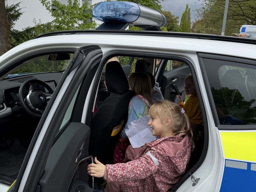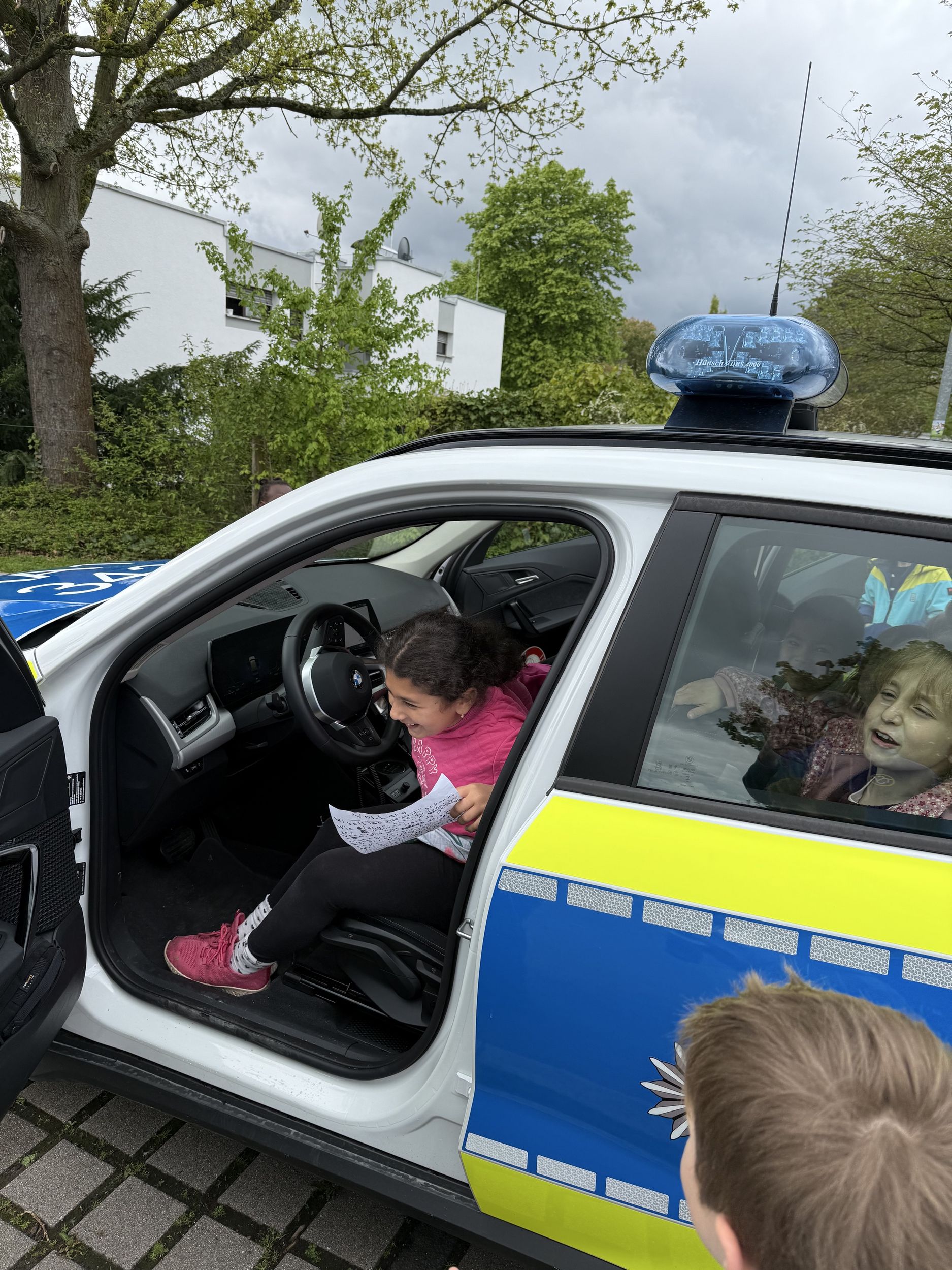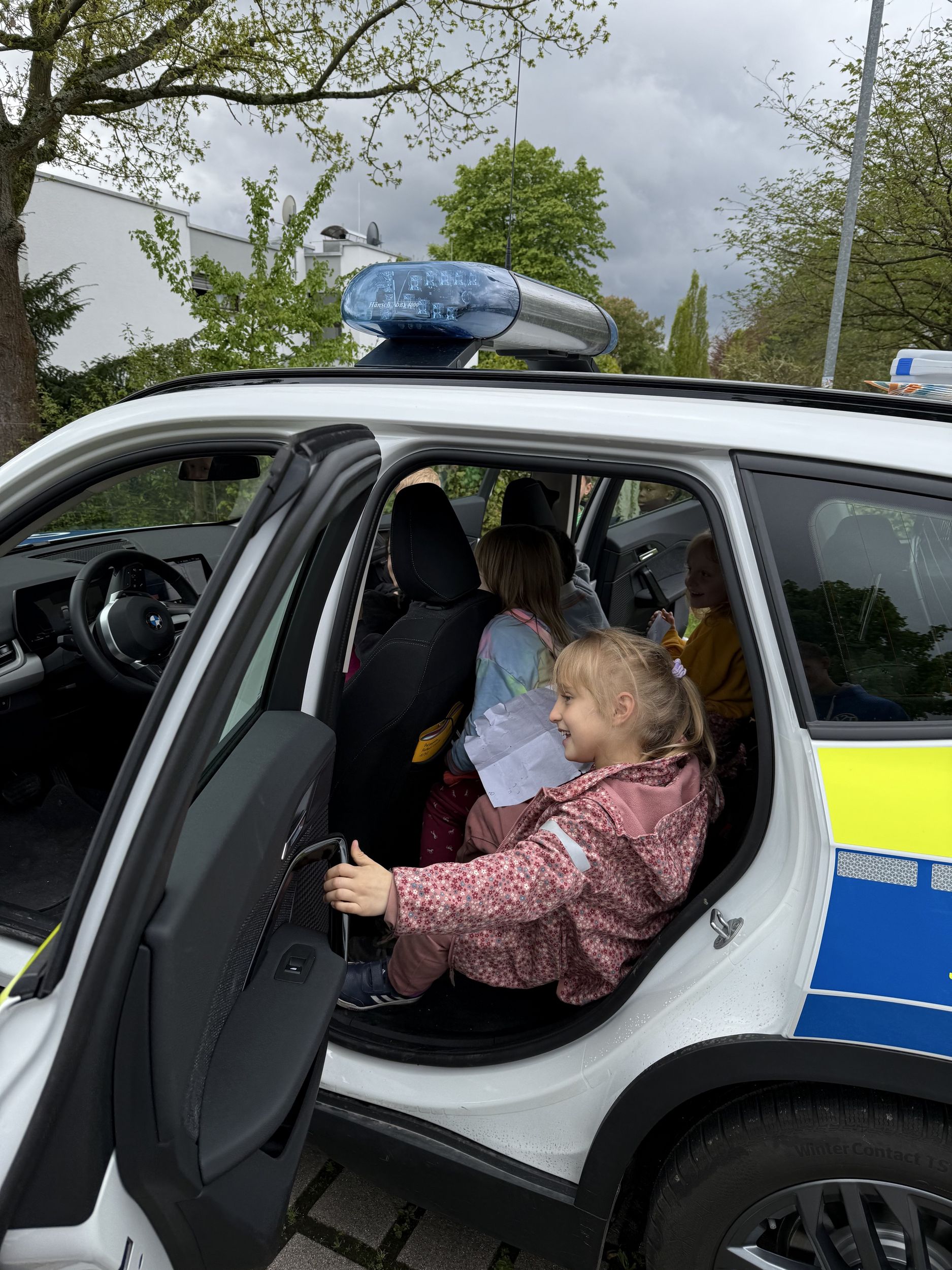 Das Highlight für die Kinder war, dass sie sich im Anschluss abwechselnd in das Polizeiauto setzen durften und sogar das Blaulicht mit Martinshorn anmachen konnten. Währenddessen mussten sich alle die Ohren zu heben, da es viel zu laut für alle war.